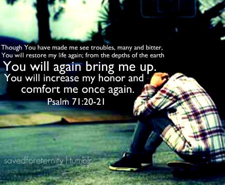 Psalms 7120-21 Though you have made me see troubles many and bitter you will restore my life again. 3 Be to me a rock of j refuge to which I. You will bring me up again even from the depths of.